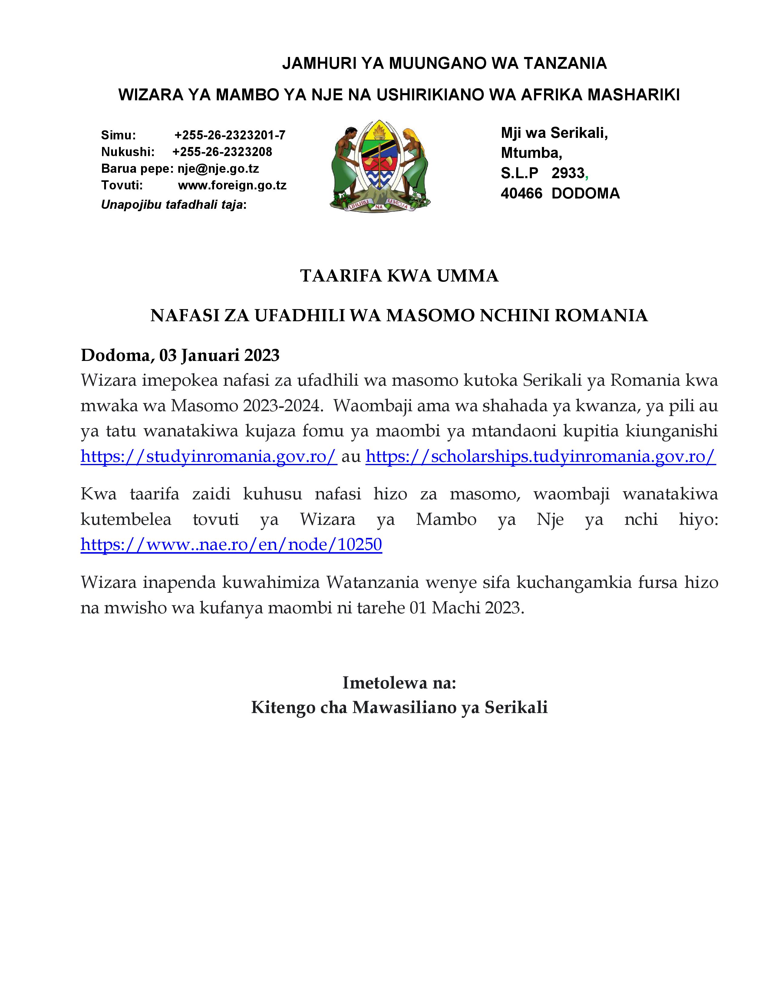 Nafasi za ufadhili wa Masomo Nchini Romania